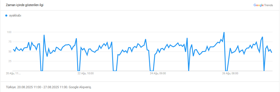 “Ayakkabı” aramasında haftalık ölçekte belirgin bir ivmelenme var; erkek ve erkek çocuk segmentleri öne çıkıyor.
